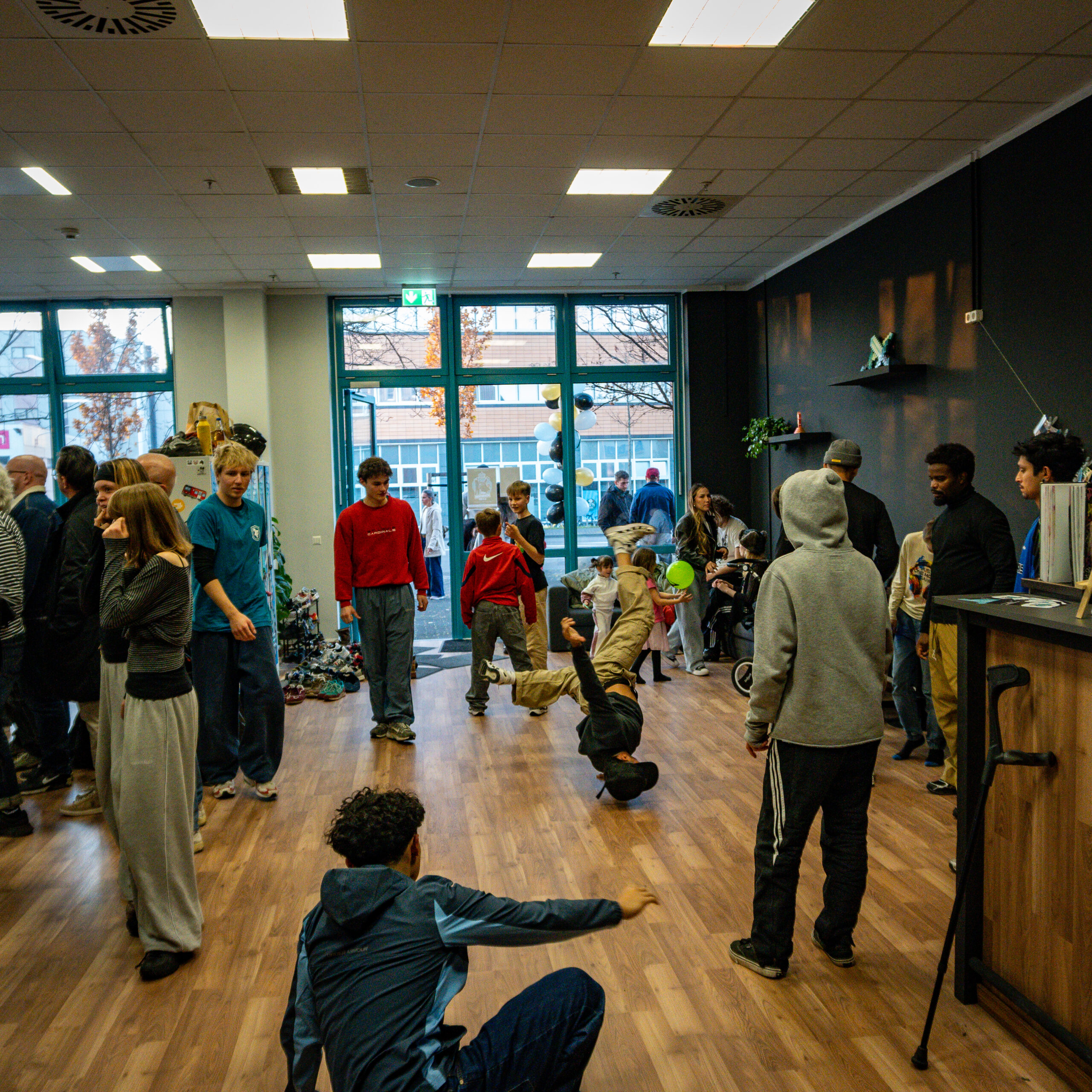 In unserem 220 m² großen Saal hast du mehr als genug Platz, um dich zu entfalten. Unsere großen Schaufenster lassen zudem viel Licht in den Raum.